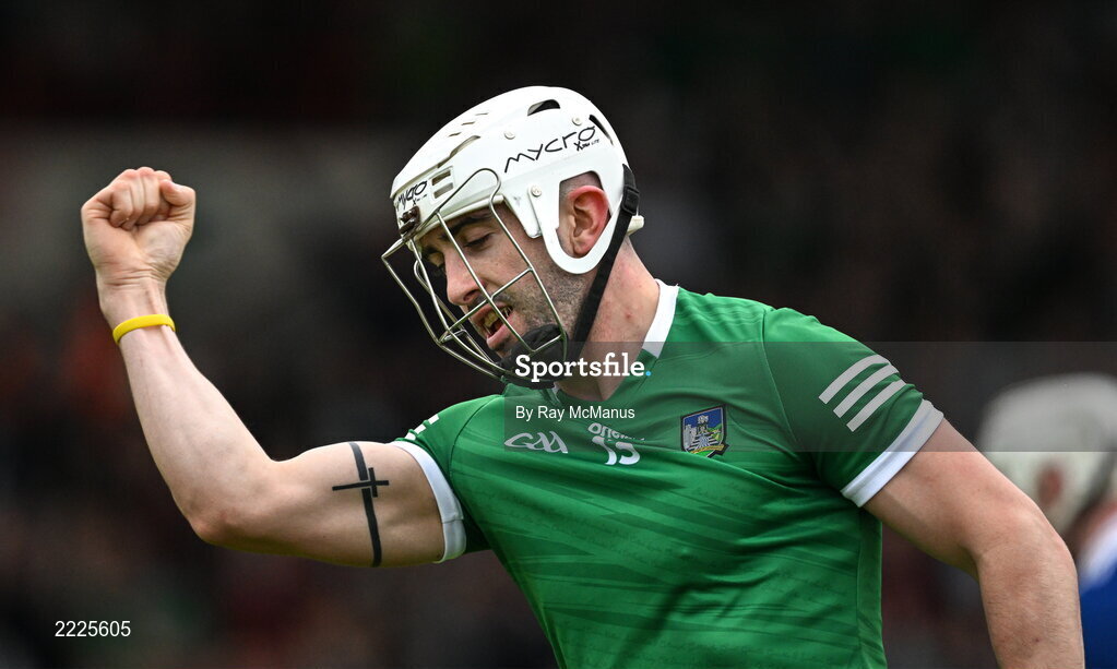 8 May 2022; Aaron Gillane of Limerick celebrates his eight minute goal during the Munster GAA Hurling Senior Championship Round 3 match between Limerick and Tipperary at TUS Gaelic Grounds in Limerick. Photo by Ray McManus/Sportsfile