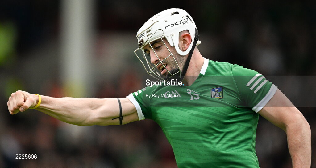 8 May 2022; Aaron Gillane of Limerick celebrates his eight minute goal during the Munster GAA Hurling Senior Championship Round 3 match between Limerick and Tipperary at TUS Gaelic Grounds in Limerick. Photo by Ray McManus/Sportsfile