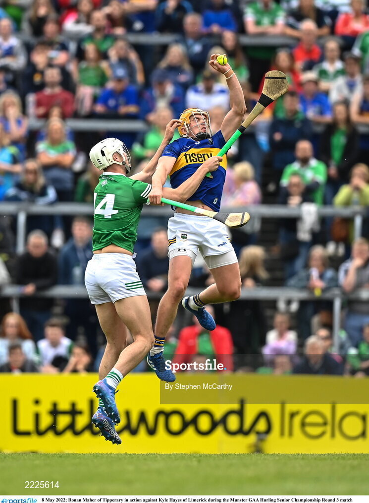 8 May 2022; Ronan Maher of Tipperary in action against Kyle Hayes of Limerick during the Munster GAA Hurling Senior Championship Round 3 match between Limerick and Tipperary at TUS Gaelic Grounds in Limerick. Photo by Stephen McCarthy/Sportsfile