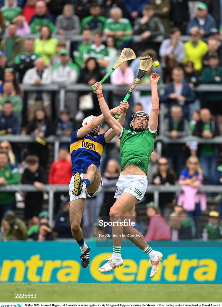 8 May 2022; Gearoid Hegarty of Limerick in action against Craig Morgan of Tipperary during the Munster GAA Hurling Senior Championship Round 3 match between Limerick and Tipperary at TUS Gaelic Grounds in Limerick. Photo by Stephen McCarthy/Sportsfile
