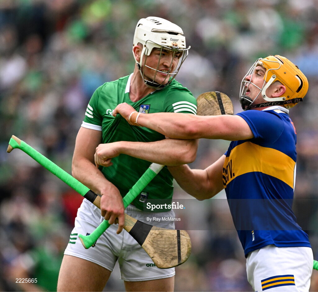 8 May 2022; Ronan Maher of Tipperary and Kyle Hayes of Limerick get up close and personal during the Munster GAA Hurling Senior Championship Round 3 match between Limerick and Tipperary at TUS Gaelic Grounds in Limerick. Photo by Ray McManus/Sportsfile