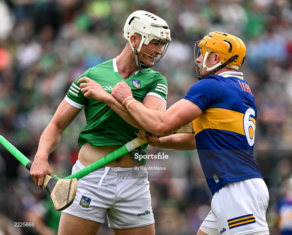 8 May 2022; Ronan Maher of Tipperary and Kyle Hayes of Limerick get up close and personal during the Munster GAA Hurling Senior Championship Round 3 match between Limerick and Tipperary at TUS Gaelic Grounds in Limerick. Photo by Ray McManus/Sportsfile