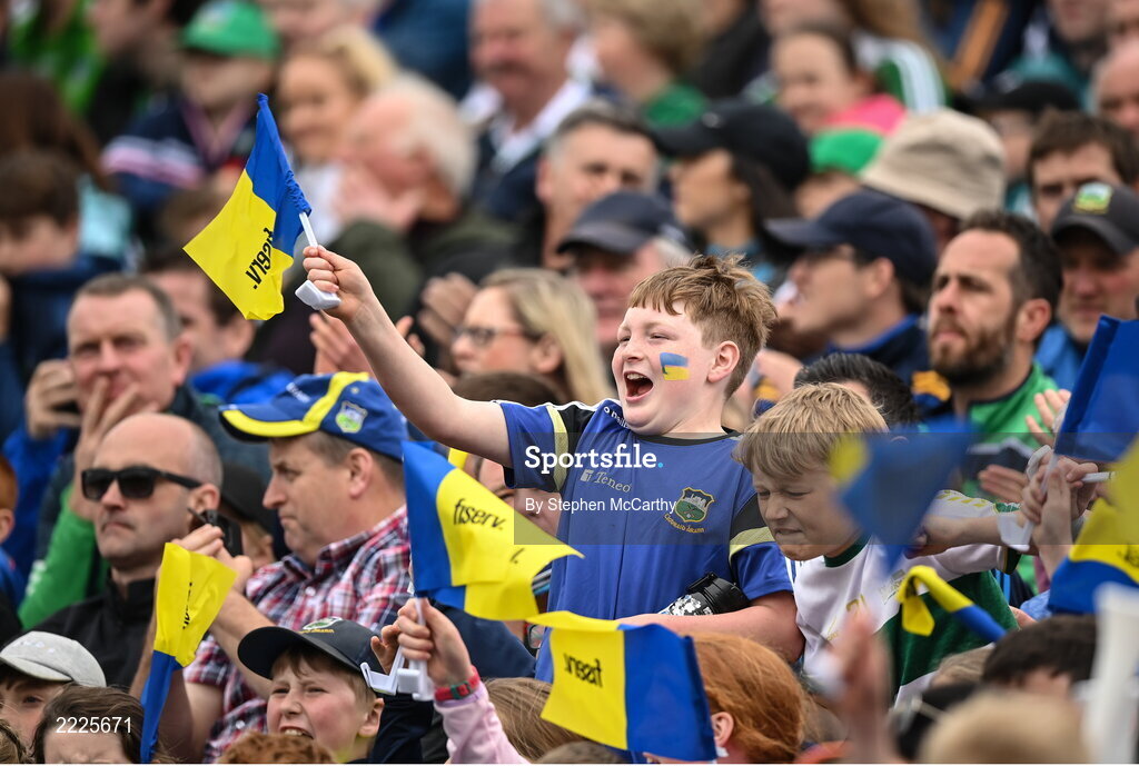 8 May 2022; Tipperary supporters celebrate a score during the Munster GAA Hurling Senior Championship Round 3 match between Limerick and Tipperary at TUS Gaelic Grounds in Limerick. Photo by Stephen McCarthy/Sportsfile