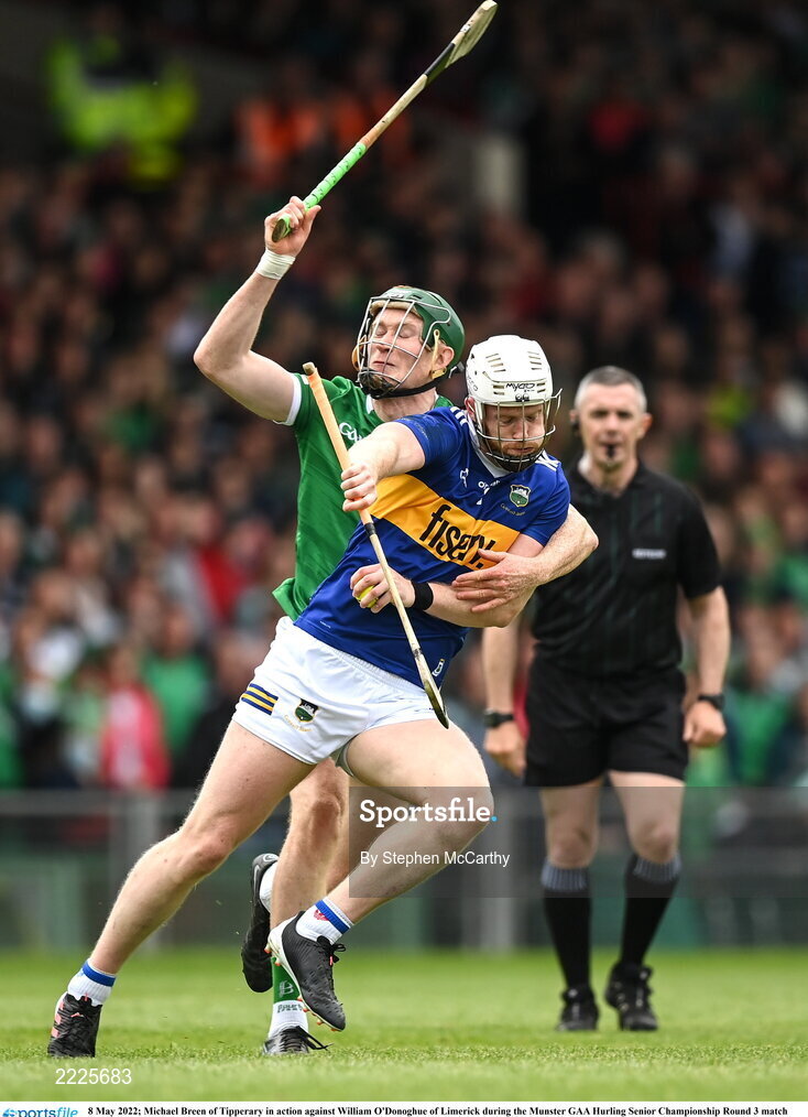 8 May 2022; Michael Breen of Tipperary in action against William O'Donoghue of Limerick during the Munster GAA Hurling Senior Championship Round 3 match between Limerick and Tipperary at TUS Gaelic Grounds in Limerick. Photo by Stephen McCarthy/Sportsfile