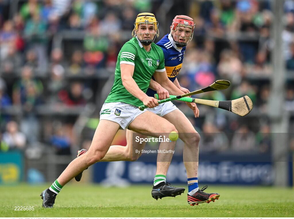 8 May 2022; Cathal O'Neill of Limerick in action against Dillon Quirke of Tipperary during the Munster GAA Hurling Senior Championship Round 3 match between Limerick and Tipperary at TUS Gaelic Grounds in Limerick. Photo by Stephen McCarthy/Sportsfile