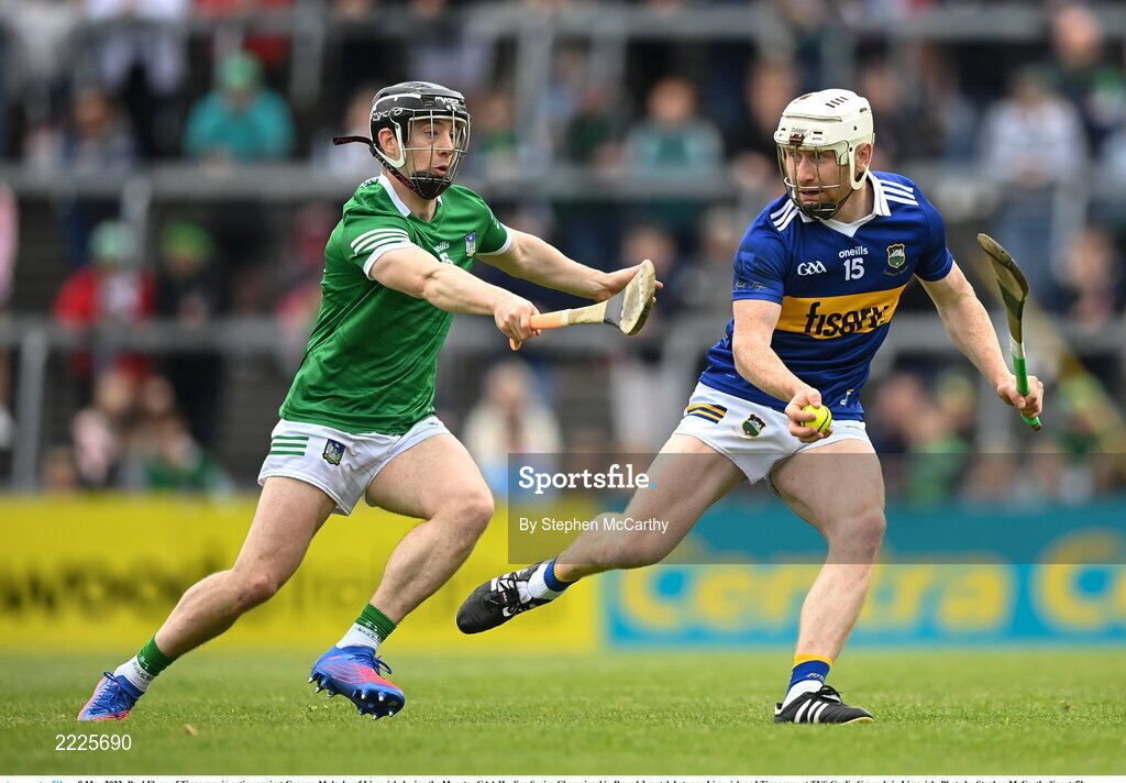 8 May 2022; Paul Flynn of Tipperary in action against Graeme Mulcahy of Limerick during the Munster GAA Hurling Senior Championship Round 3 match between Limerick and Tipperary at TUS Gaelic Grounds in Limerick. Photo by Stephen McCarthy/Sportsfile