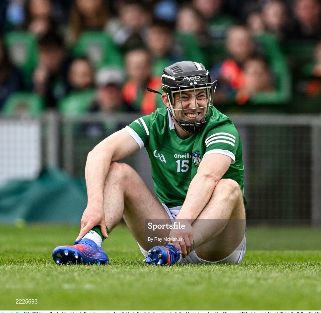 8 May 2022; Graeme Mulcahy of Limerick reacts after picking up an injury during the Munster GAA Hurling Senior Championship Round 3 match between Limerick and Tipperary at TUS Gaelic Grounds in Limerick. Photo by Ray McManus/Sportsfile
