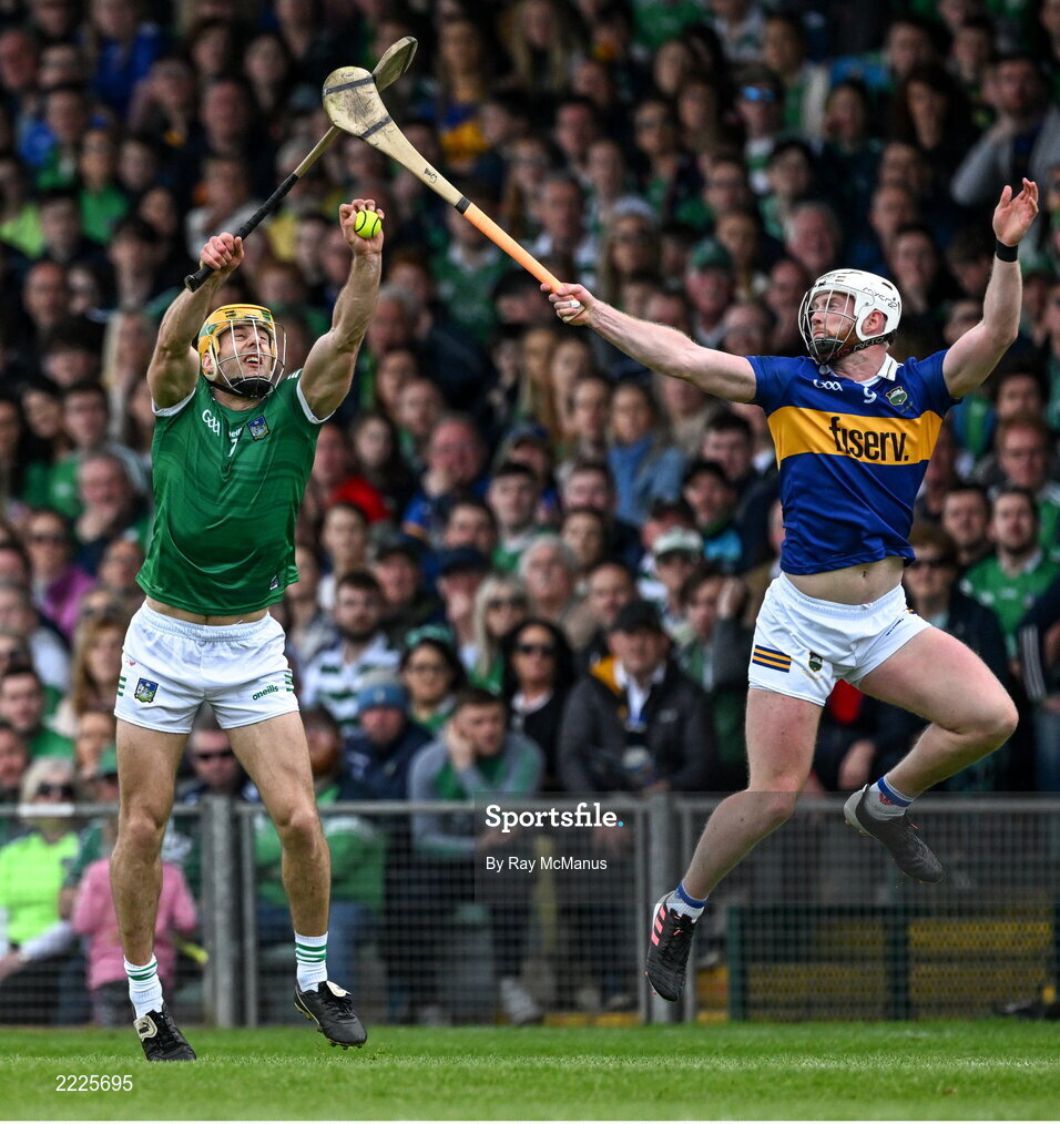 8 May 2022; Dan Morrisey of Limerick in action against Michael Breen of Tipperary during the Munster GAA Hurling Senior Championship Round 3 match between Limerick and Tipperary at TUS Gaelic Grounds in Limerick. Photo by Ray McManus/Sportsfile