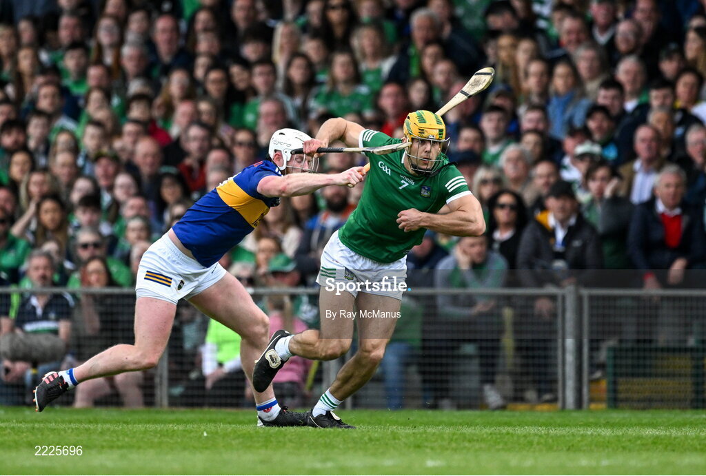 8 May 2022; Dan Morrisey of Limerick is tackled by Michael Breen of Tipperary during the Munster GAA Hurling Senior Championship Round 3 match between Limerick and Tipperary at TUS Gaelic Grounds in Limerick. Photo by Ray McManus/Sportsfile