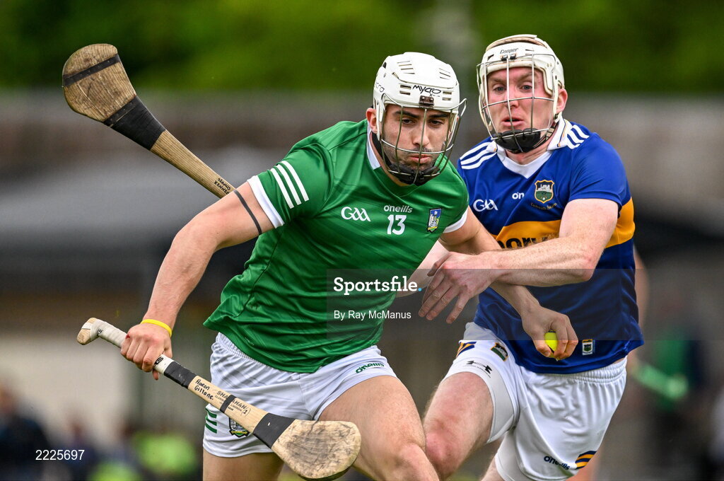 8 May 2022; Aaron Gillane of Limerick is tackled by Seamus Kennedy of Tipperary during the Munster GAA Hurling Senior Championship Round 3 match between Limerick and Tipperary at TUS Gaelic Grounds in Limerick. Photo by Ray McManus/Sportsfile