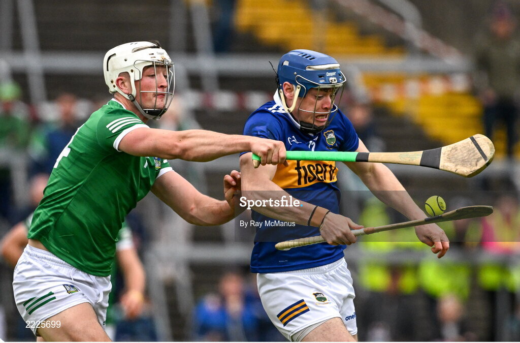 8 May 2022; Conor Bowe of Tipperary is tackled by Kyle Hayes of Limerick during the Munster GAA Hurling Senior Championship Round 3 match between Limerick and Tipperary at TUS Gaelic Grounds in Limerick. Photo by Ray McManus/Sportsfile