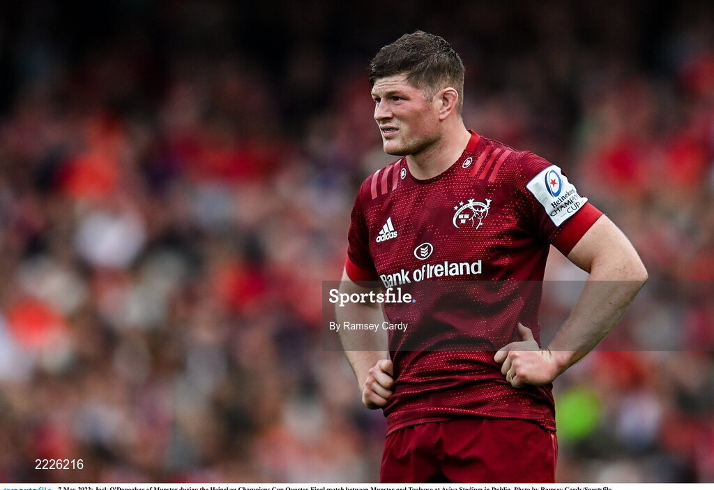 7 May 2022; Jack O'Donoghue of Munster during the Heineken Champions Cup Quarter-Final match between Munster and Toulouse at Aviva Stadium in Dublin. Photo by Ramsey Cardy/Sportsfile