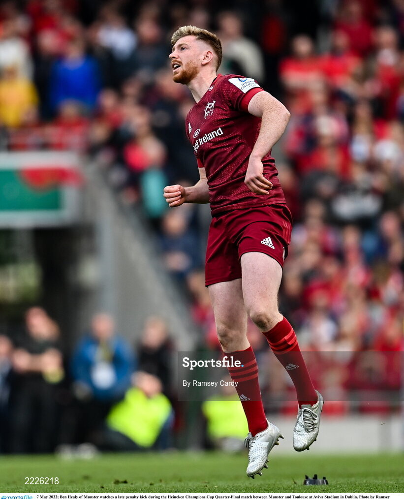 7 May 2022; Ben Healy of Munster watches a late penalty kick during the Heineken Champions Cup Quarter-Final match between Munster and Toulouse at Aviva Stadium in Dublin. Photo by Ramsey Cardy/Sportsfile