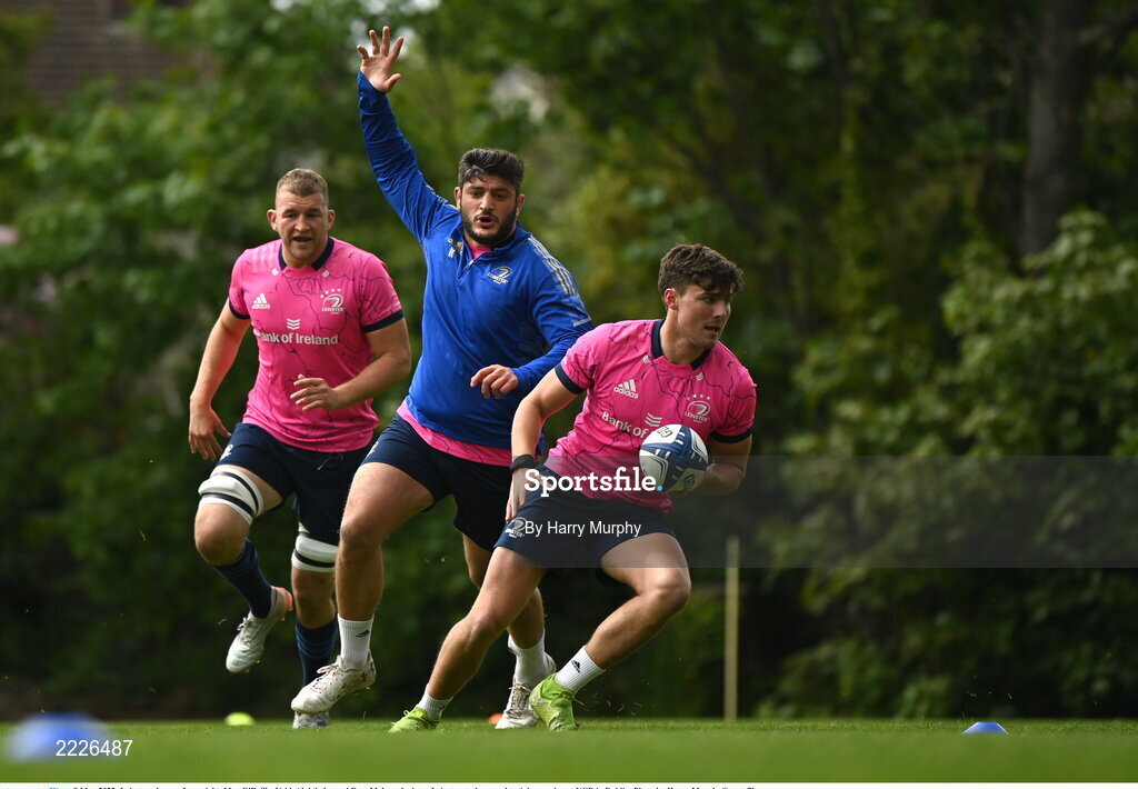 9 May 2022; Leinster players, from right, Max O'Reilly, Vakh Abdaladze and Ross Molony during a Leinster rugby squad training session at UCD in Dublin. Photo by Harry Murphy/Sportsfile
