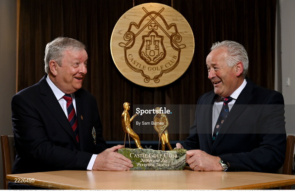 10 May 2022; The 60th edition of the prestigious All-Ireland Father & Son Foursomes competition will take place at Castle Golf Club, Rathfarnham, Dublin in July, sponsored by Dawson Jewellers. Qualifying rounds for this year’s tournament take place on Saturday 2nd and Sunday 3rd July with matches taking place over the following week culminating in the final on Sunday 10th July. Visit www.castlegc.ie to reserve your preferred time with online booking opening on Monday 16th July @ 10am. Pictured are Sponsor and owner of Dawson Jewellers Ken McDonagh, right, and Castle Golf Club captain Declan Allen, with the Castle Golf Club Father and Son Perpetual Trophy at at Castle Golf Club, Rathfarnham in Dublin. Photo by Sam Barnes/Sportsfile