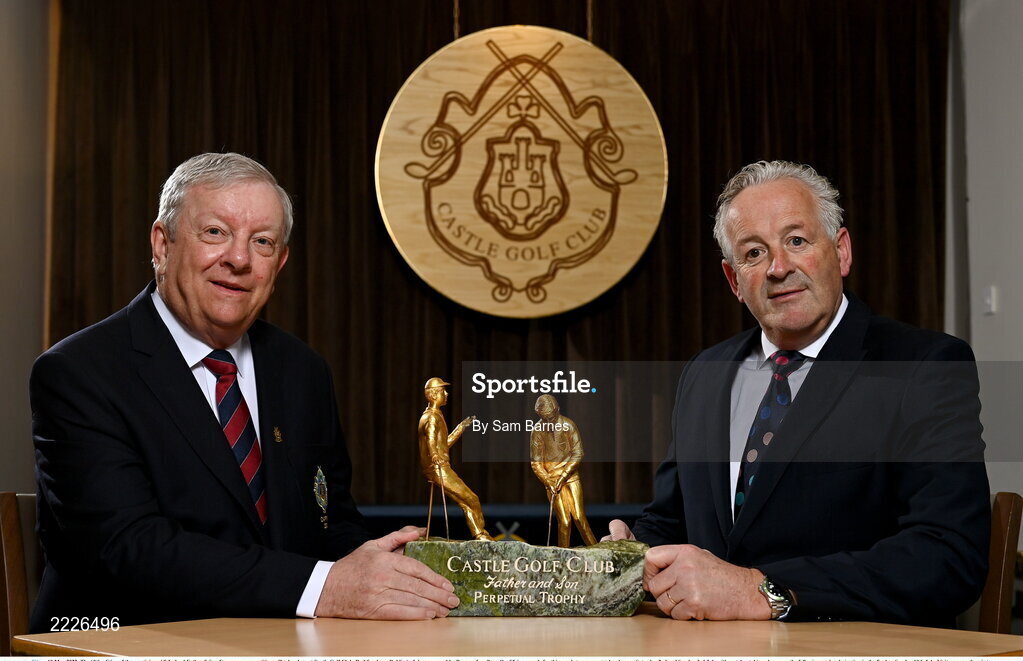 10 May 2022; The 60th edition of the prestigious All-Ireland Father & Son Foursomes competition will take place at Castle Golf Club, Rathfarnham, Dublin in July, sponsored by Dawson Jewellers. Qualifying rounds for this year’s tournament take place on Saturday 2nd and Sunday 3rd July with matches taking place over the following week culminating in the final on Sunday 10th July. Visit www.castlegc.ie to reserve your preferred time with online booking opening on Monday 16th July @ 10am. Pictured are Sponsor and owner of Dawson Jewellers Ken McDonagh, right, and Castle Golf Club captain Declan Allen, with the Castle Golf Club Father and Son Perpetual Trophy at at Castle Golf Club, Rathfarnham in Dublin. Photo by Sam Barnes/Sportsfile