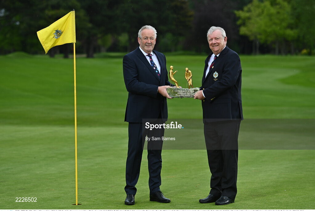 10 May 2022; The 60th edition of the prestigious All-Ireland Father & Son Foursomes competition will take place at Castle Golf Club, Rathfarnham, Dublin in July, sponsored by Dawson Jewellers. Qualifying rounds for this year’s tournament take place on Saturday 2nd and Sunday 3rd July with matches taking place over the following week culminating in the final on Sunday 10th July. Visit www.castlegc.ie to reserve your preferred time with online booking opening on Monday 16th July @ 10am. Pictured are Sponsor and owner of Dawson Jewellers Ken McDonagh, left, and Castle Golf Club captain Declan Allen, with the Castle Golf Club Father and Son Perpetual Trophy at at Castle Golf Club, Rathfarnham in Dublin. Photo by Sam Barnes/Sportsfile