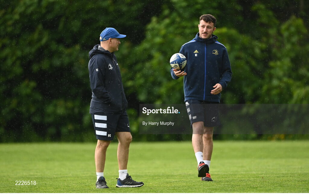 9 May 2022; Will Connors speaks with backs coach Felipe Contepomi during a Leinster rugby squad training session at UCD in Dublin. Photo by Harry Murphy/Sportsfile