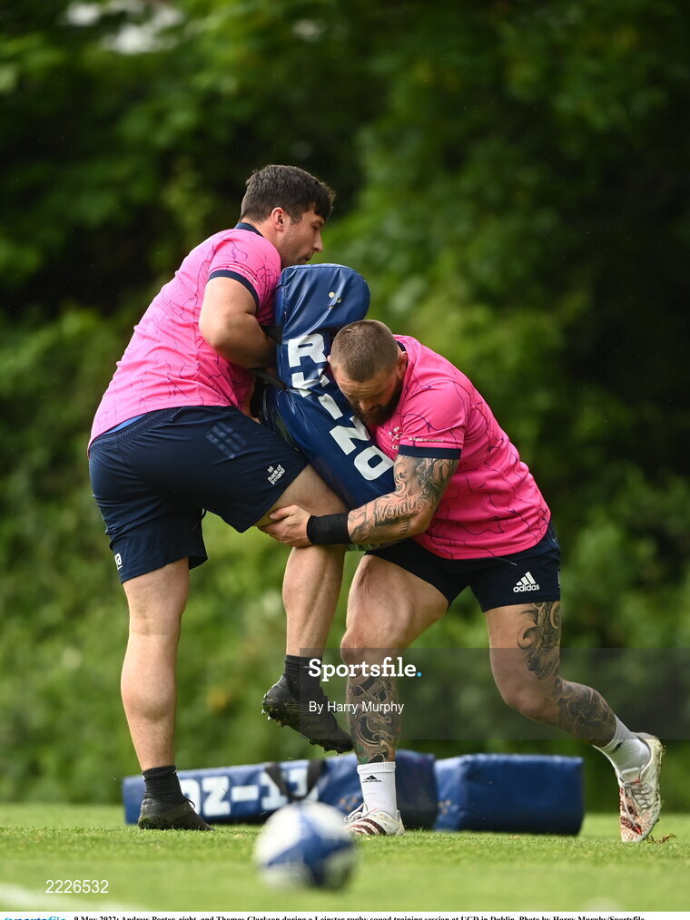 9 May 2022; Andrew Porter, right, and Thomas Clarkson during a Leinster rugby squad training session at UCD in Dublin. Photo by Harry Murphy/Sportsfile