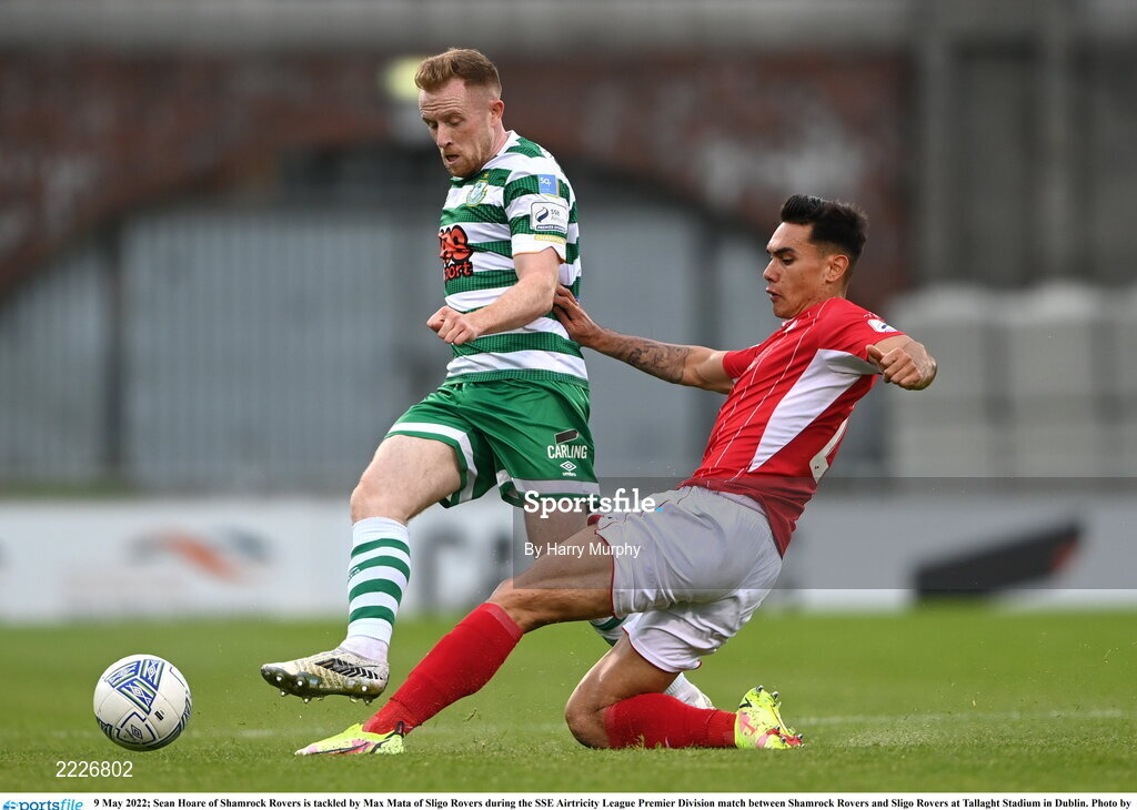 9 May 2022; Sean Hoare of Shamrock Rovers is tackled by Max Mata of Sligo Rovers during the SSE Airtricity League Premier Division match between Shamrock Rovers and Sligo Rovers at Tallaght Stadium in Dublin. Photo by Harry Murphy/Sportsfile