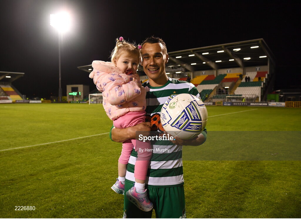 9 May 2022; Graham Burke of Shamrock Rovers with his daughter Posie, aged two, after scoring a hat trick in the SSE Airtricity League Premier Division match between Shamrock Rovers and Sligo Rovers at Tallaght Stadium in Dublin. Photo by Harry Murphy/Sportsfile