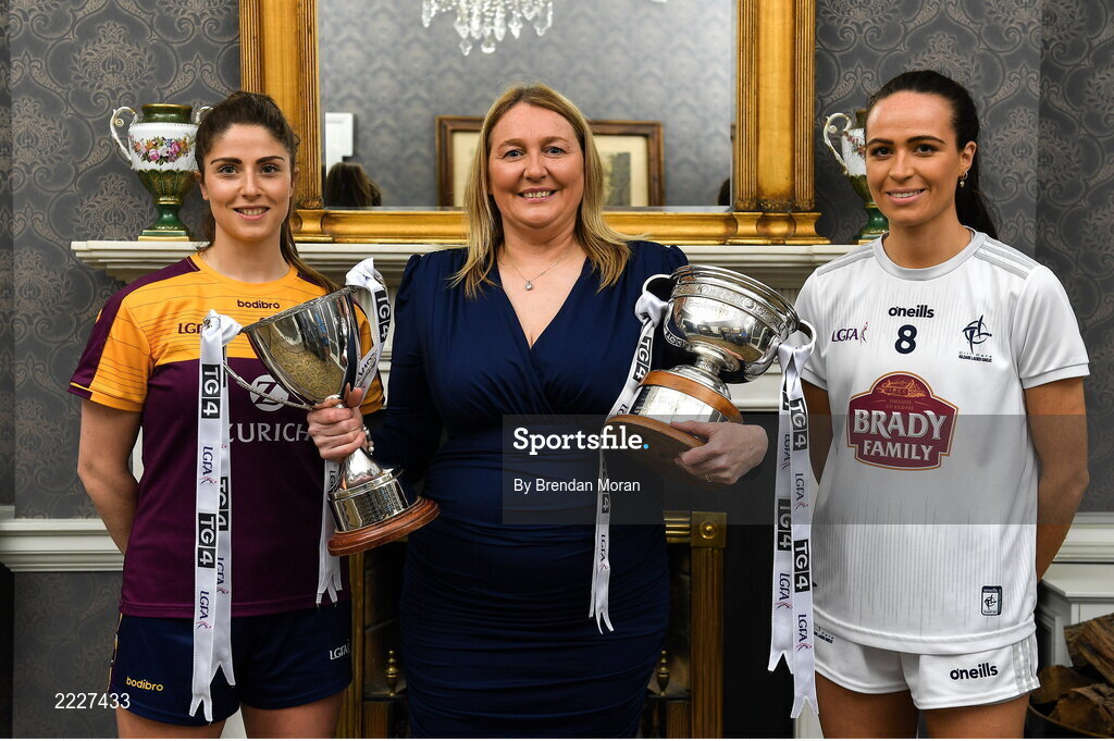 11 May 2022; Roisin Murphy of Wexford, left, and Grace Clifford of Kildare with Leinster LGFA President Trina Murray at the Leinster LGFA Captain's Evening at the Johnstown Estate in Enfield before they meet in the 2022 TG4 Leinster LGFA Intermediate Football Championship Final next Sunday. Photo by Brendan Moran/Sportsfile
