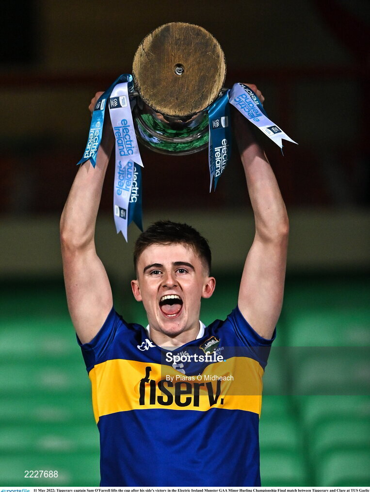 11 May 2022; Tipperary captain Sam O'Farrell lifts the cup after his side's victory in the Electric Ireland Munster GAA Minor Hurling Championship Final match between Tipperary and Clare at TUS Gaelic Grounds in Limerick. Photo by Piaras Ó Mídheach/Sportsfile