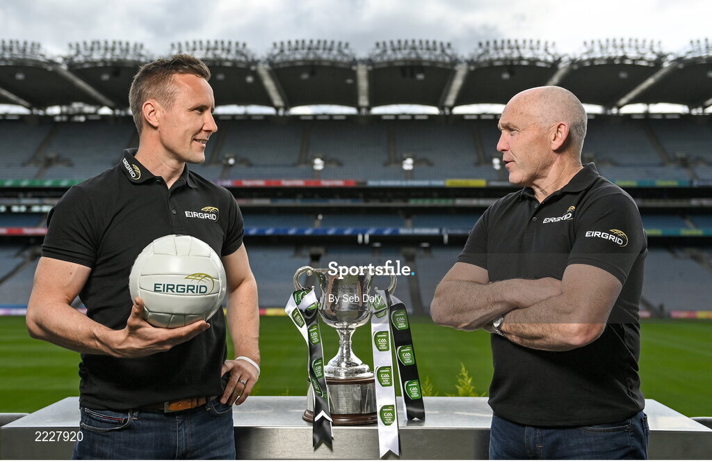 12 May 2022; Kildare U20 manager Brian Flanagan, left, and Tyrone U20 manager Paul Devlin pictured ahead of the EirGrid GAA Football U20 All-Ireland Final this Saturday. EirGrid, Ireland’s grid operator, has partnered with the GAA since 2015 as sponsor of the U20 GAA Football All-Ireland Championship. Photo by Seb Daly/Sportsfile