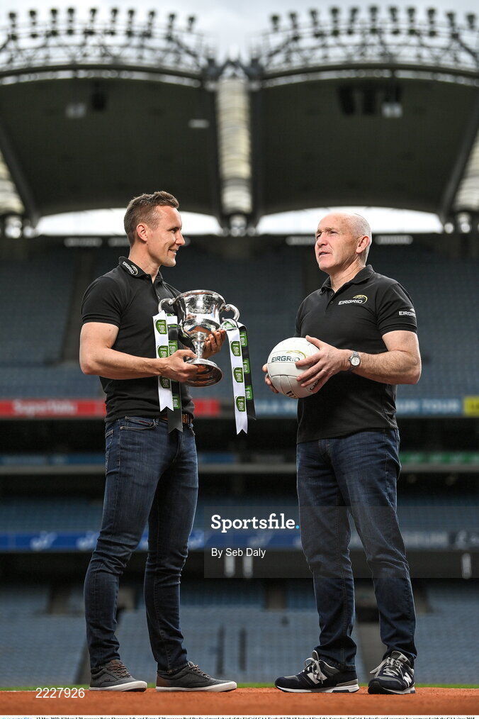 12 May 2022; Kildare U20 manager Brian Flanagan, left, and Tyrone U20 manager Paul Devlin pictured ahead of the EirGrid GAA Football U20 All-Ireland Final this Saturday. EirGrid, Ireland’s grid operator, has partnered with the GAA since 2015 as sponsor of the U20 GAA Football All-Ireland Championship. Photo by Seb Daly/Sportsfile
