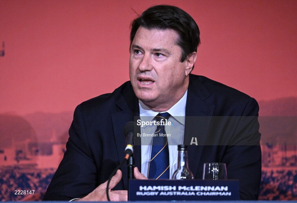 12 May 2022; Rugby Australia chairman Hamish McLennan speaking during a World Rugby Cup future hosts announcement media conference at the Convention Centre in Dublin. Photo by Brendan Moran/Sportsfile