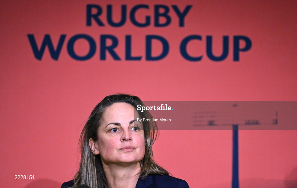 12 May 2022; Rugby Football Union chief operating officer and chief financial officer Sue Day speaking during a World Rugby Cup future hosts announcement media conference at the Convention Centre in Dublin. Photo by Brendan Moran/Sportsfile