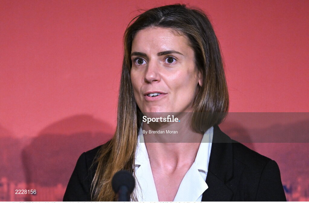 12 May 2022; England captain Sarah Hunter speaking during a World Rugby Cup future hosts announcement media conference at the Convention Centre in Dublin. Photo by Brendan Moran/Sportsfile
