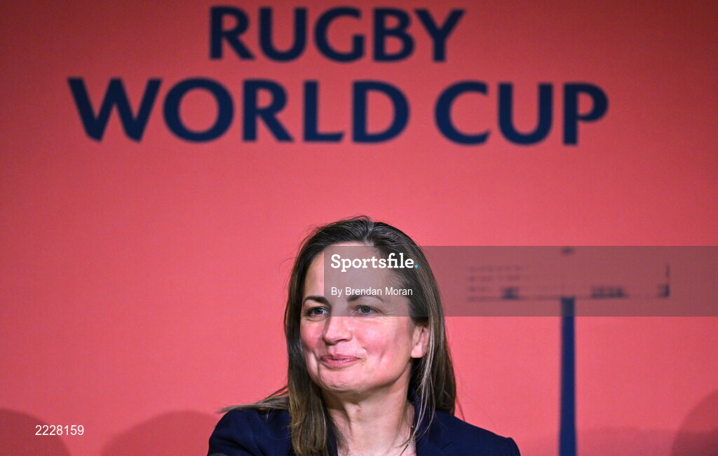 12 May 2022; Rugby Football Union chief operating officer and chief financial officer Sue Day speaking during a World Rugby Cup future hosts announcement media conference at the Convention Centre in Dublin. Photo by Brendan Moran/Sportsfile