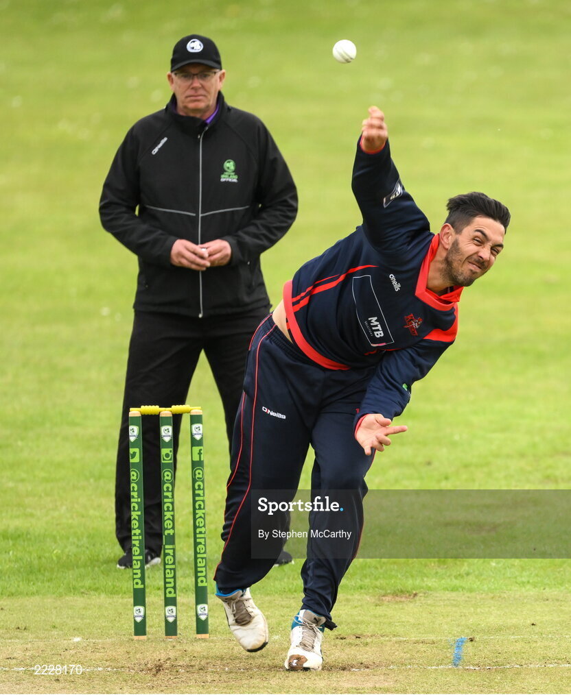 12 May 2022; Ruhan Pretorius of Northern Knights bowls during the Cricket Ireland Inter-Provincial Cup match between North West Warriors and Northern Knights at Bready Cricket Club in Magheramason, Tyrone. Photo by Stephen McCarthy/Sportsfile