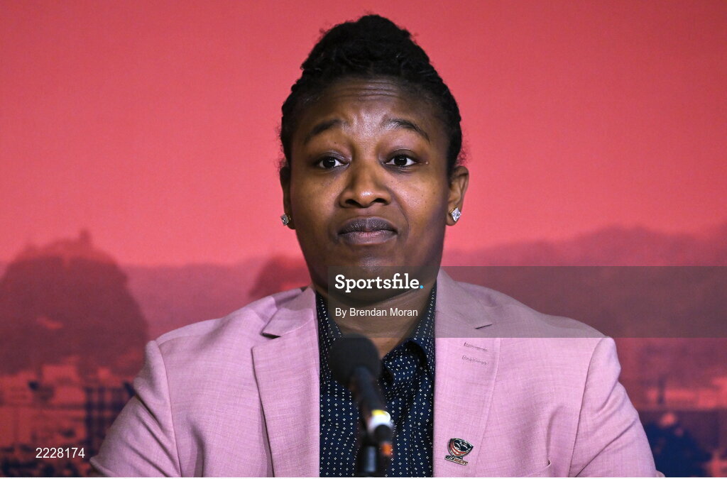 12 May 2022; USA Rugby board of directors athlete representative Victoria Folayan speaking during a World Rugby Cup future hosts announcement media conference at the Convention Centre in Dublin. Photo by Brendan Moran/Sportsfile