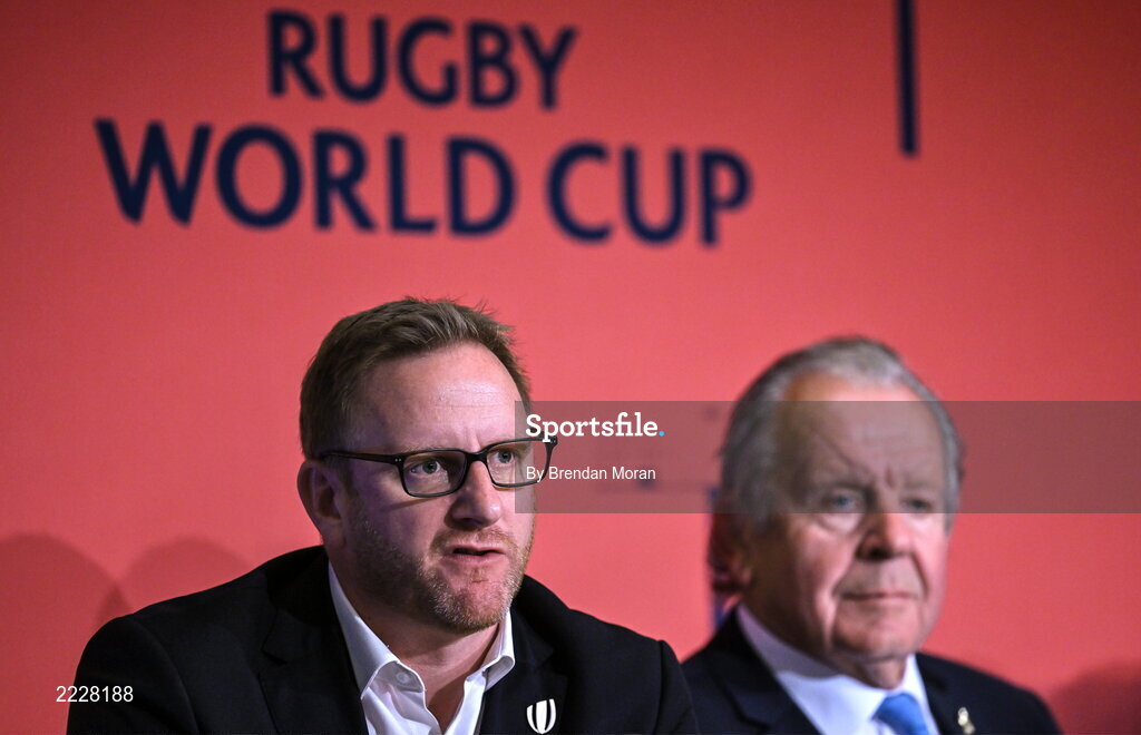 12 May 2022; World Rugby chief executive Alan Gilpin, left, and World Rugby chairman Sir Bill Beaumont during a World Rugby Cup future hosts announcement media conference at the Convention Centre in Dublin. Photo by Brendan Moran/Sportsfile