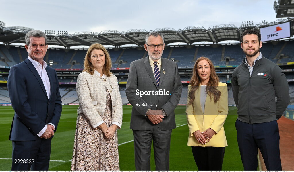 13 May 2022; PwC today announced that it will become the title sponsor of the PwC Camogie All-Stars. In addition, along with the GAA and the GPA, PwC is announcing their renewal of the PwC All-Stars and PwC GPA Women's Player of the Month awards for a further three years. Pictured at Croke Park today at the sponsorship announcements were, from left, PwC Ireland Managing Partner Feargal O'Rourke, Uachtarán an Cumann Camógaíochta Hilda Breslin, Uachtarán Chumann Lúthcleas Gael Larry McCarthy, PwC Asset Management Tax Leader & former Carlow dual county player Marie Coady, and GPA Chief Executive Tom Parsons. Photo by Seb Daly/Sportsfile