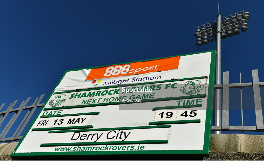 13 May 2022; A stadium sign advertising this evening's match before the SSE Airtricity League Premier Division match between Shamrock Rovers and Derry City at Tallaght Stadium in Dublin. Photo by Seb Daly/Sportsfile
