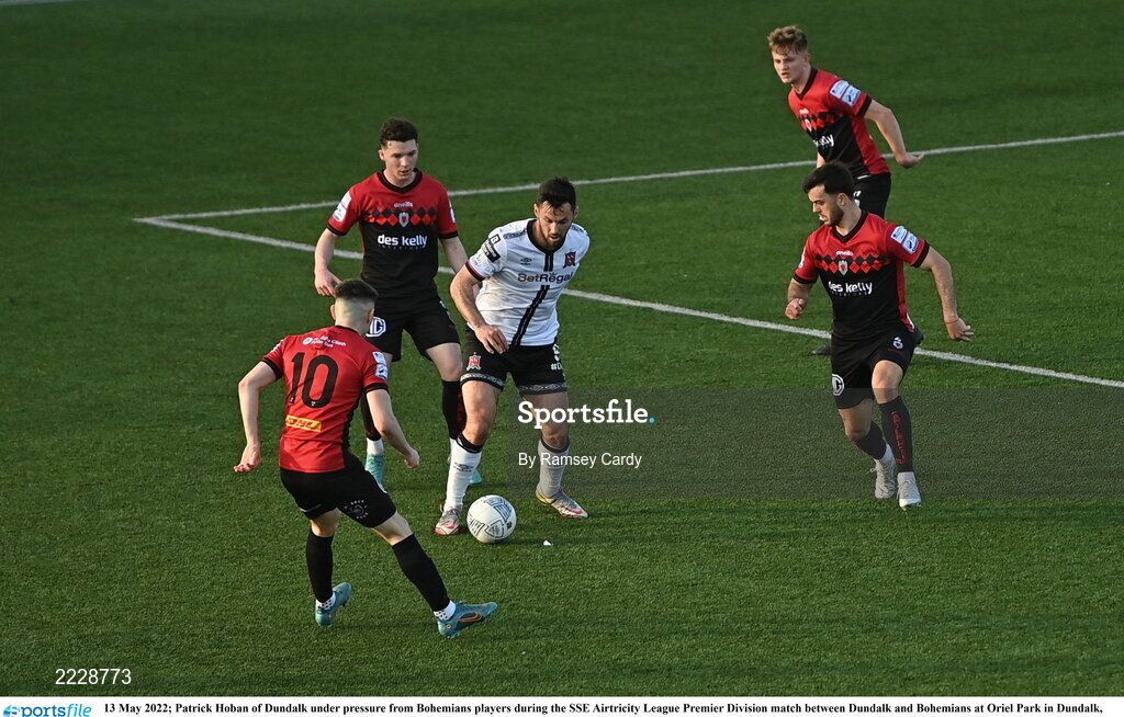 13 May 2022; Patrick Hoban of Dundalk under pressure from Bohemians players during the SSE Airtricity League Premier Division match between Dundalk and Bohemians at Oriel Park in Dundalk, Louth. Photo by Ramsey Cardy/Sportsfile