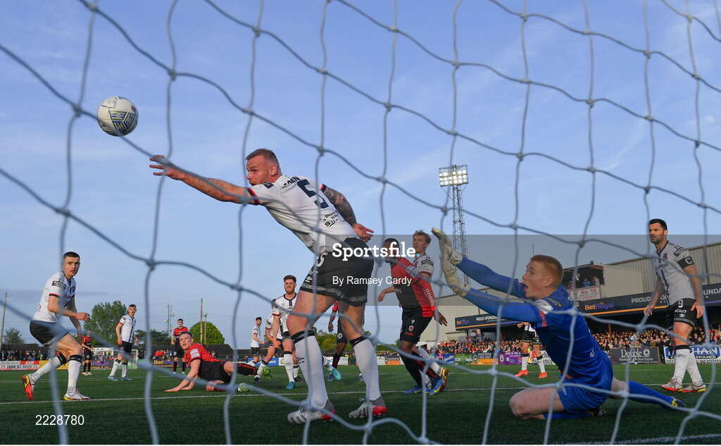 13 May 2022; Dundalk goalkeeper Nathan Shepperd and Mark Connolly of Dundalk fail to stop the shot at goal by Ciarán Kelly of Bohemians during the SSE Airtricity League Premier Division match between Dundalk and Bohemians at Oriel Park in Dundalk, Louth. Photo by Ramsey Cardy/Sportsfile