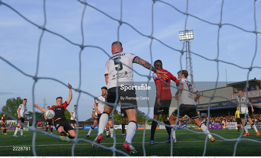 13 May 2022; Ciarán Kelly of Bohemians shoots to score his side's first goal during the SSE Airtricity League Premier Division match between Dundalk and Bohemians at Oriel Park in Dundalk, Louth. Photo by Ramsey Cardy/Sportsfile