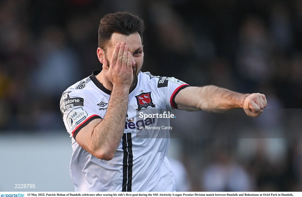 13 May 2022; Patrick Hoban of Dundalk celebrates after scoring his side's first goal during the SSE Airtricity League Premier Division match between Dundalk and Bohemians at Oriel Park in Dundalk, Louth. Photo by Ramsey Cardy/Sportsfile