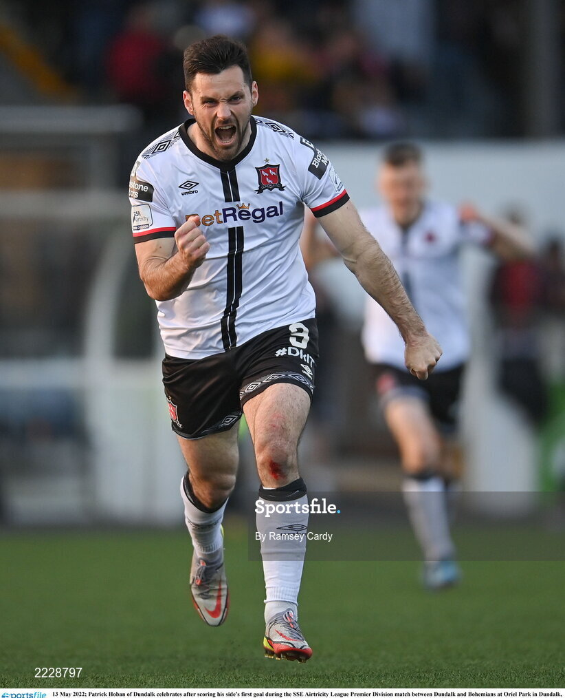 13 May 2022; Patrick Hoban of Dundalk celebrates after scoring his side's first goal during the SSE Airtricity League Premier Division match between Dundalk and Bohemians at Oriel Park in Dundalk, Louth. Photo by Ramsey Cardy/Sportsfile
