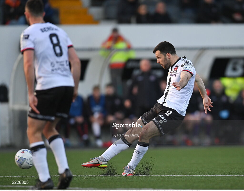 13 May 2022; Patrick Hoban of Dundalk shoots to score his side's first goal during the SSE Airtricity League Premier Division match between Dundalk and Bohemians at Oriel Park in Dundalk, Louth. Photo by Ramsey Cardy/Sportsfile