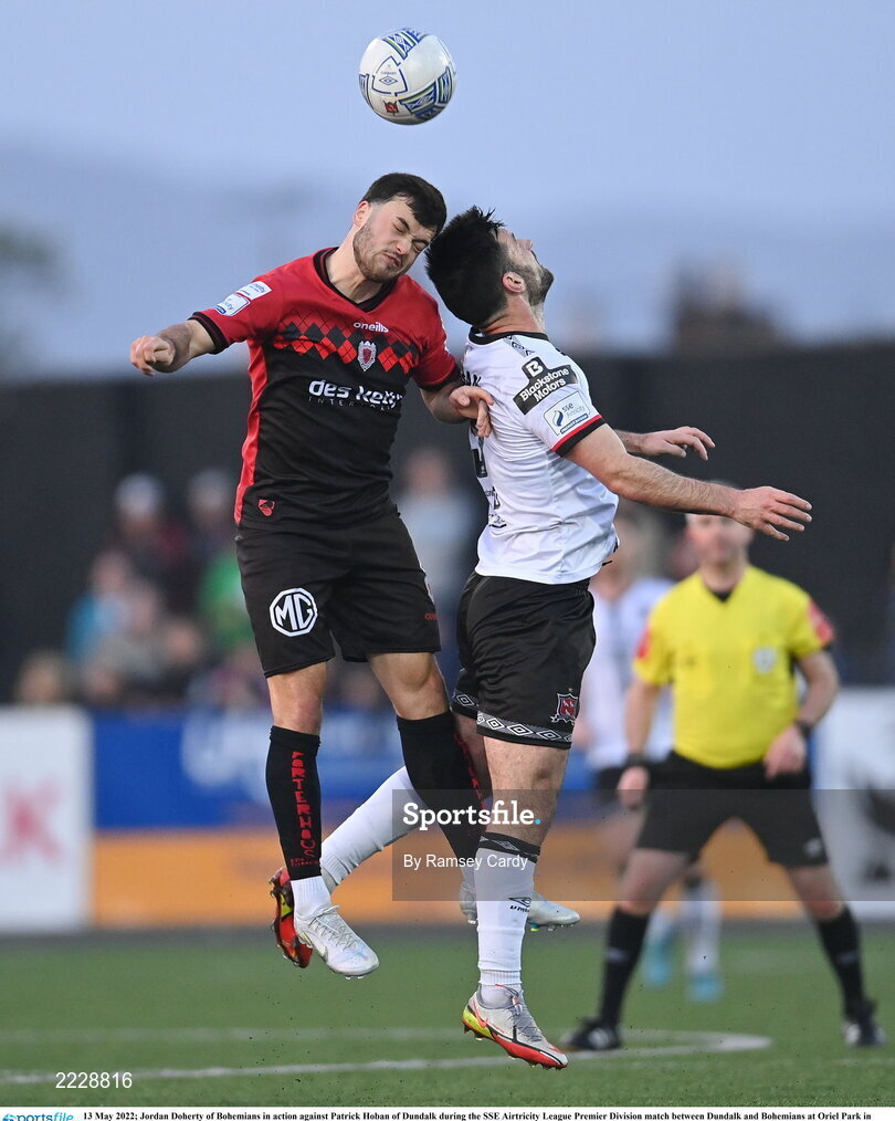 13 May 2022; Jordan Doherty of Bohemians in action against Patrick Hoban of Dundalk during the SSE Airtricity League Premier Division match between Dundalk and Bohemians at Oriel Park in Dundalk, Louth. Photo by Ramsey Cardy/Sportsfile