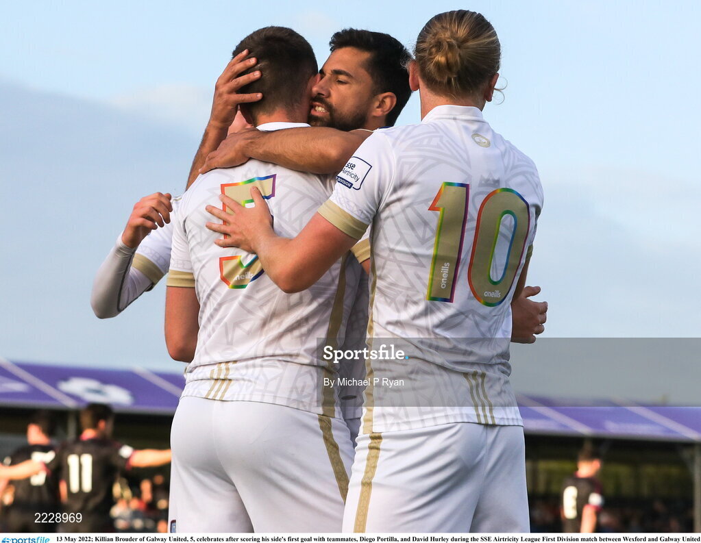 13 May 2022; Killian Brouder of Galway United, 5, celebrates after scoring his side's first goal with teammates, Diego Portilla, and David Hurley during the SSE Airtricity League First Division match between Wexford and Galway United at Ferrycarrig Park in Wexford. Photo by Michael P Ryan/Sportsfile