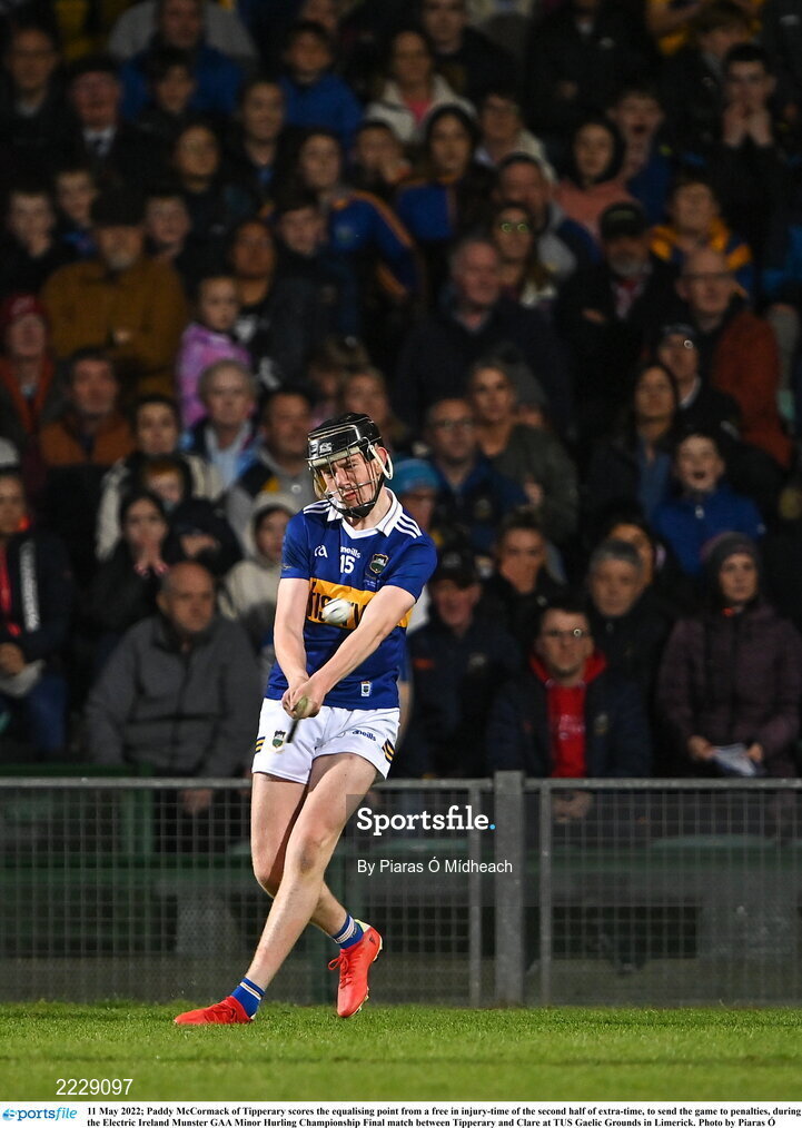 11 May 2022; Paddy McCormack of Tipperary scores the equalising point from a free in injury-time of the second half of extra-time, to send the game to penalties, during the Electric Ireland Munster GAA Minor Hurling Championship Final match between Tipperary and Clare at TUS Gaelic Grounds in Limerick. Photo by Piaras Ó Mídheach/Sportsfile