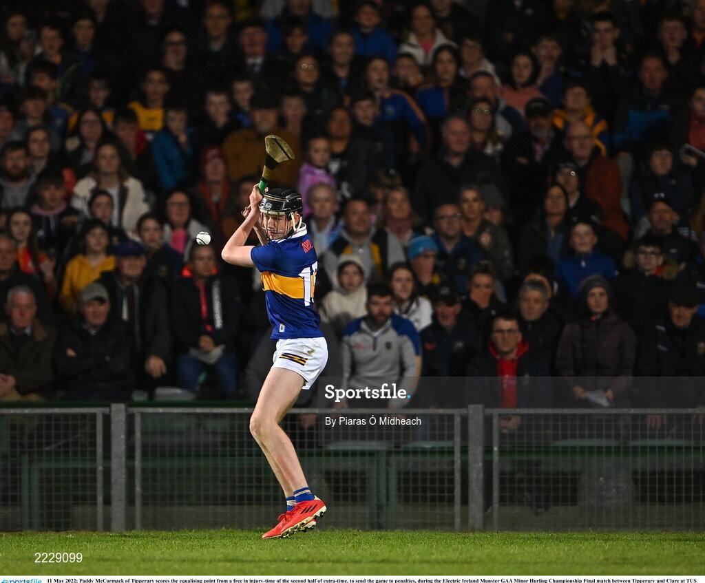 11 May 2022; Paddy McCormack of Tipperary scores the equalising point from a free in injury-time of the second half of extra-time, to send the game to penalties, during the Electric Ireland Munster GAA Minor Hurling Championship Final match between Tipperary and Clare at TUS Gaelic Grounds in Limerick. Photo by Piaras Ó Mídheach/Sportsfile