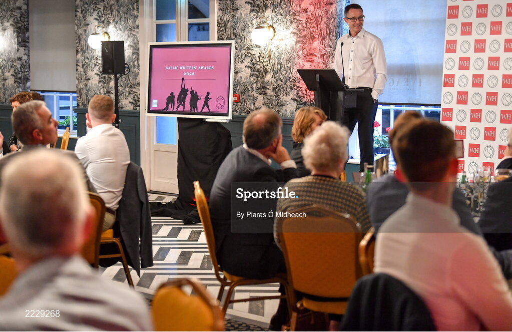 13 May 2022; Chairman of the Gaelic Writers’ Association Karl O’Kane speaking at the Gaelic Writers’ Association Awards, which took place at the Iveagh Garden Hotel in Dublin, and are this year supported by Wilson Hartnell, who are celebrating their 50th year in business. Photo by Piaras Ó Mídheach/Sportsfile