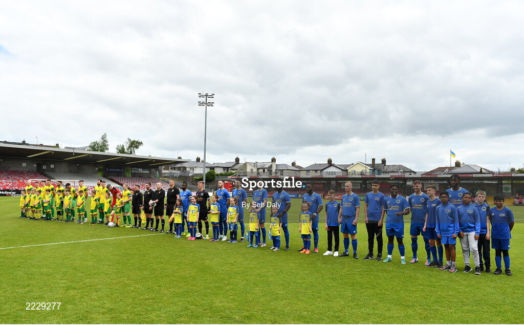 14 May 2022; Players and officials line up before the FAI Centenary Intermediate Cup Final 2021/2022 match between Rockmount AFC and Bluebell United at Turner's Cross in Cork. Photo by Seb Daly/Sportsfile